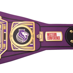 Embrace the royalty of the Sacramento Kings with this NBA Championship Belt. The iconic crown logo, set against a backdrop of purple and black, captures the team’s regal spirit and the unwavering loyalty of its fans. This Championship Belt is more than just an accessory; it’s a symbol of the Kings’ legacy, a reminder of the electrifying atmosphere at the Golden 1 Center, and a testament to the belief in a future filled with championship glory.