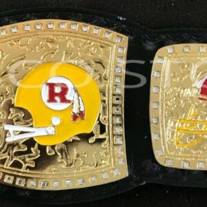 Washington Redskins Championship belt is beautiful piece of art by craftsmen at working at Zees Belts. The color combination on this championship belt is simply eye catching. Zinc metal is used to make the WASHINGTON REDSKINS Championship Belt. High quality gold plating and paint work is done on the belt. This Championship belt is a replica of an original but it is impossible to differentiate in original and replica. Real Cowhide leather is used in making of this championship belt. At Zees Belts craftsmen does not compromise on quality. This belt is handcrafted and the detailing on the belt is simply beautiful. This is available at Zees Belts. So what are you waiting for? Order your WASHINGTON REDSKINS Championship Belt now.