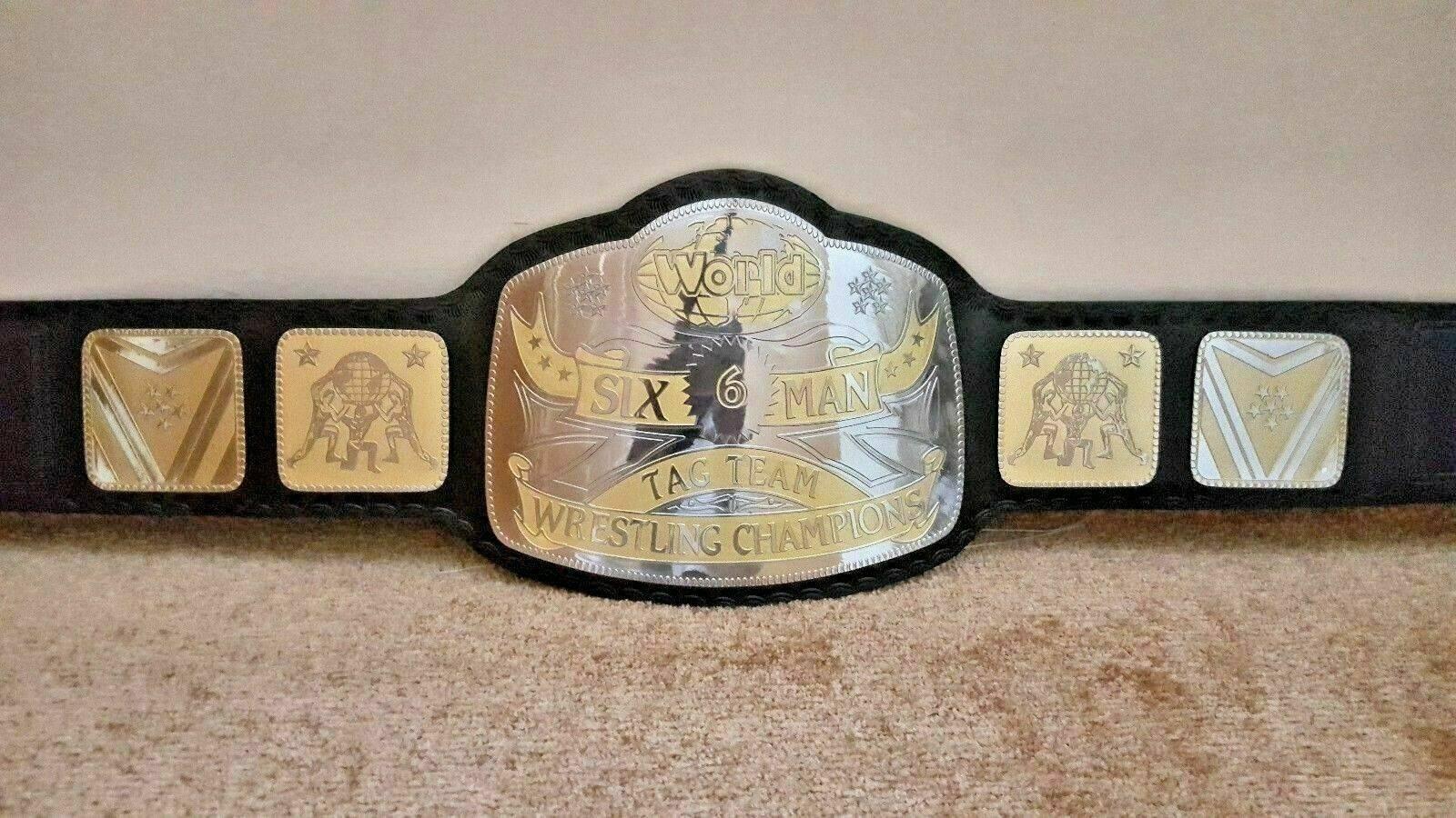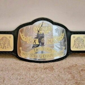 If you want to add some extra edge to your professional wrestling collection, check out our WORLD SIX-MAN TAG TEAM Championship Belt Replica!. World Six Man Tag Team Championship Belt is made with brass metal. High-quality paintwork is done on the metal plates. The straps are made with real Cowhide leather. This can fit on waist sizes up to 46 inches. The belt is entirely customizable. This Championship belt is a real deal. So, What are you waiting for? Hurry up. Grab your Six Man Tag Team Championship belt now from Zees Belts.