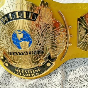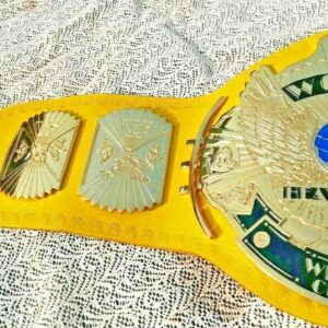 The belt is handcrafted by our skilled craftsmen using quality materials The plates are made in zinc with high quality gold plating. WWF WINGED EAGLE ULTIMATE WARRIOR Zinc Championship Belt. 4mm Zinc Plates have deep etching and extremely excellent finished quality. We use finest vege-tanned top grain soft leather strap with excellent hand tooling on it. The plates are then curved and gold polished. Finest quality paint work on plates is done by skilled painters.