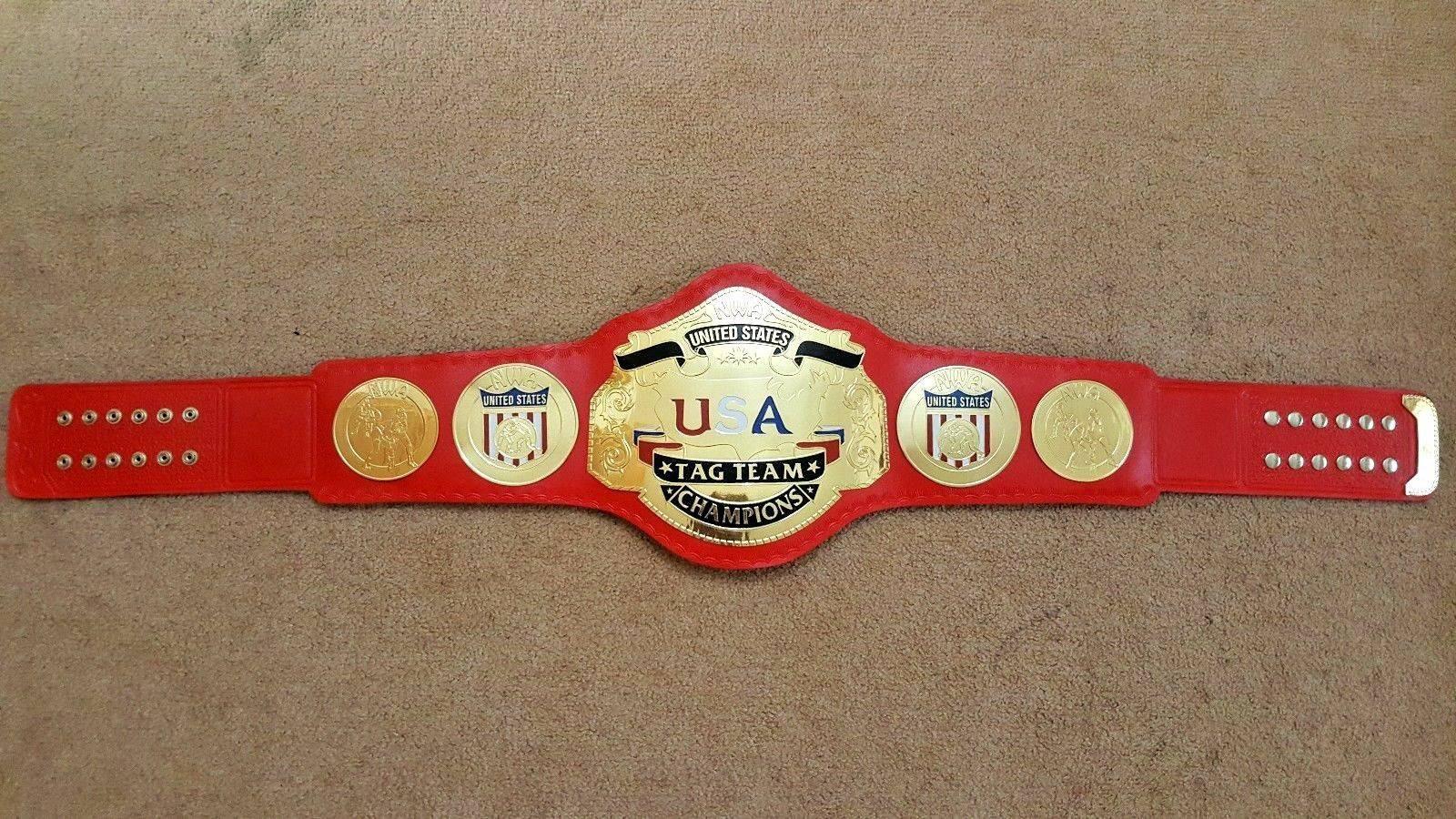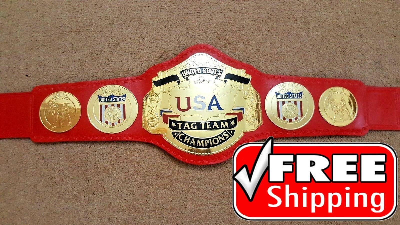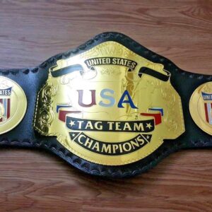 THE NWA US Tag Team is made with pure brass metal. Brass plates are deeply etched. This Championship belt is made by skilled craftsmen working at Zees Belts. The plates used in making NWA US Tag Team Championship belts are gold polished, and high-quality paint work is done on the plates. Real cowhide leather is used to make the straps of this championship belt. The straps of this championship belt are available in Red and Black colors. THE NWA US Tag Team Championship belt is available at Zees Belts. Order your championship belt now.