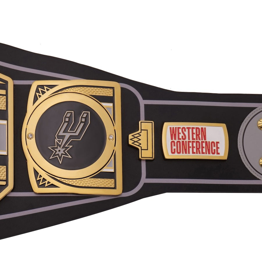 Feel the echoes of the Alamodome with this San Antonio Spurs NBA Championship Belt. The iconic spur logo, set against a backdrop of black and silver, captures the team’s quiet dominance and the unwavering loyalty of its fans. This Championship Belt is more than just a symbol of victory; it’s a tangible connection to the Spurs’ dynasty, a reminder of the championship banners hanging in the AT&T Center, and a tribute to the legends who have defined San Antonio basketball.